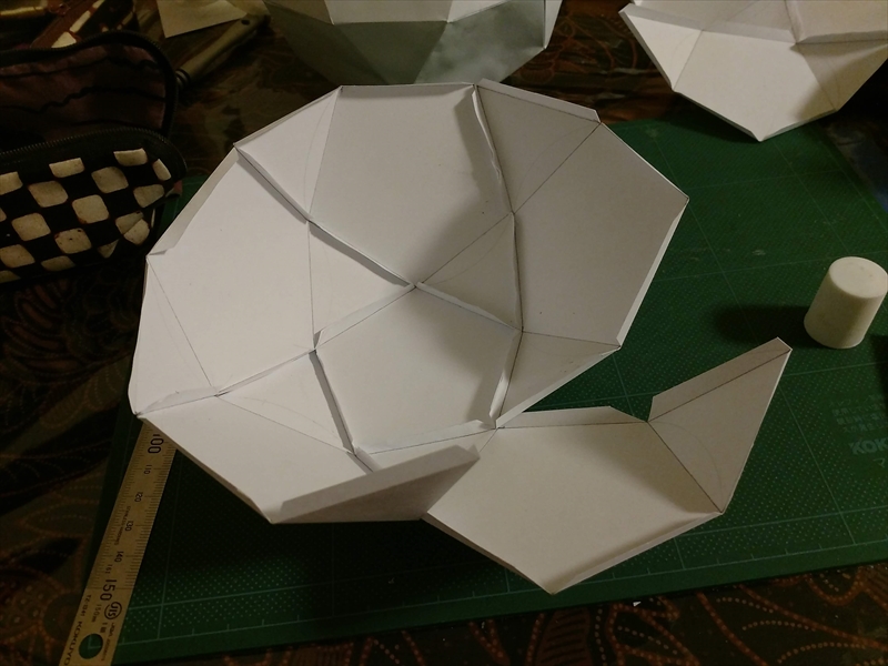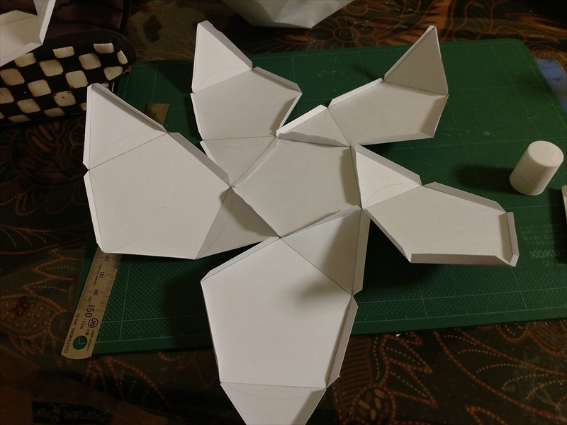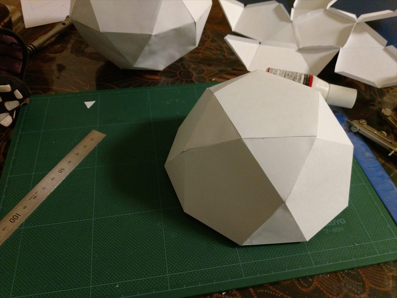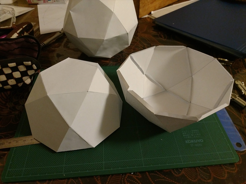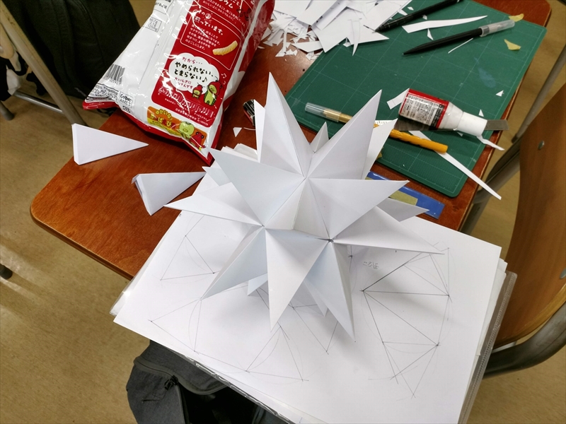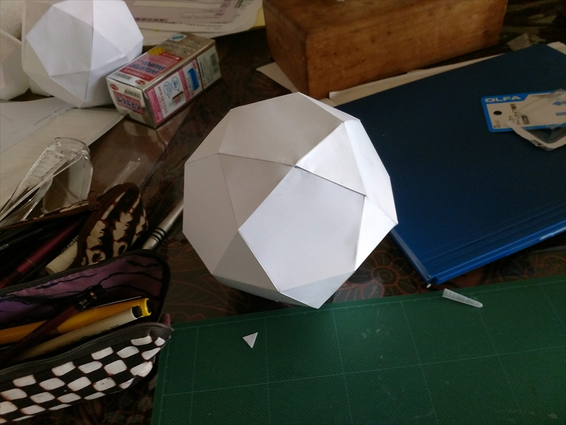 試作をよく見ながら,組み立てやすいように展開図を描きます.ある程度複雑な多面体になると紙のサイズなどが原因で展開図が複数枚に及ぶことがあり,こういったときに試作が役立ちます.