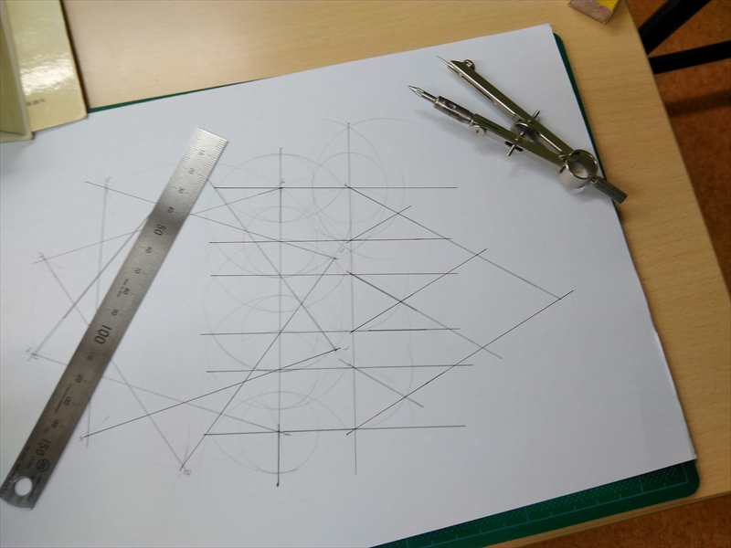 紙をカッターマットに敷き,コンパスと定規で展開図を徒然なるままに描きます.この時,その図形を構成している(正)多角形を一つずつ書くのがポイントです.